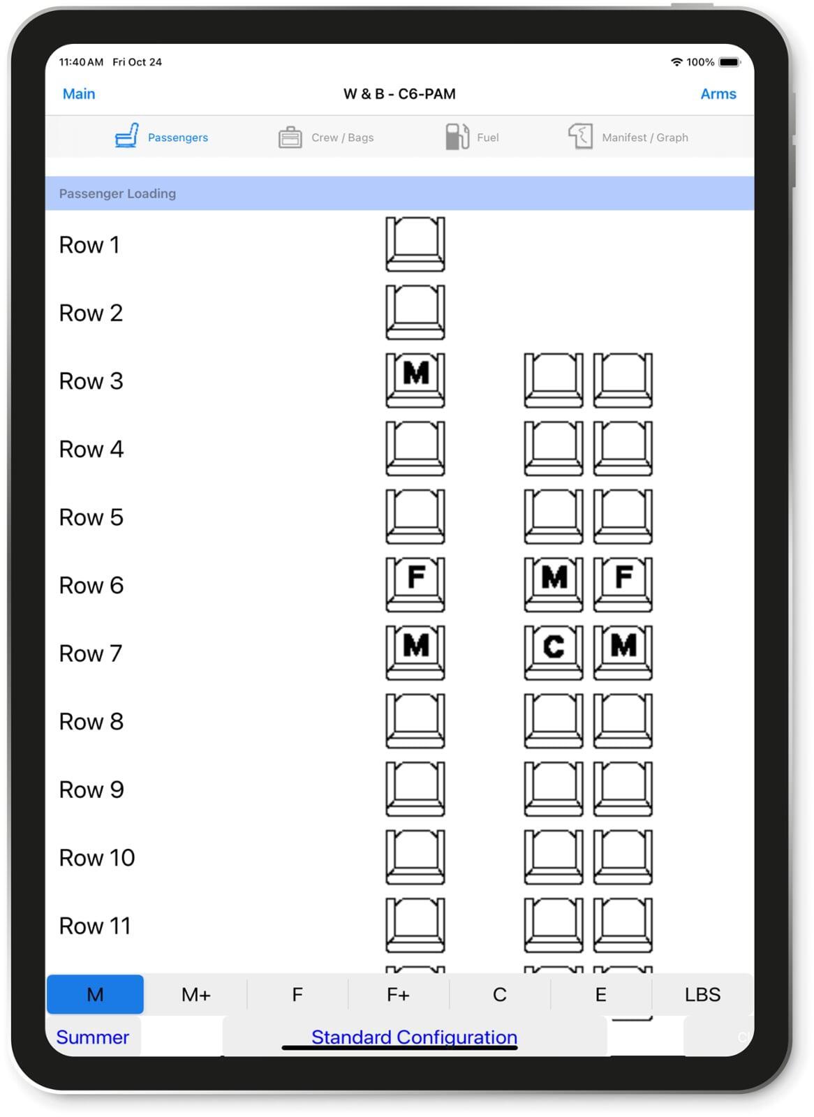 Graphical display of the interior seats with touch screen placement of passengers. Default weights or actual weights can be utilized. Zone seating and multiple configurations (ie medevac) are available.