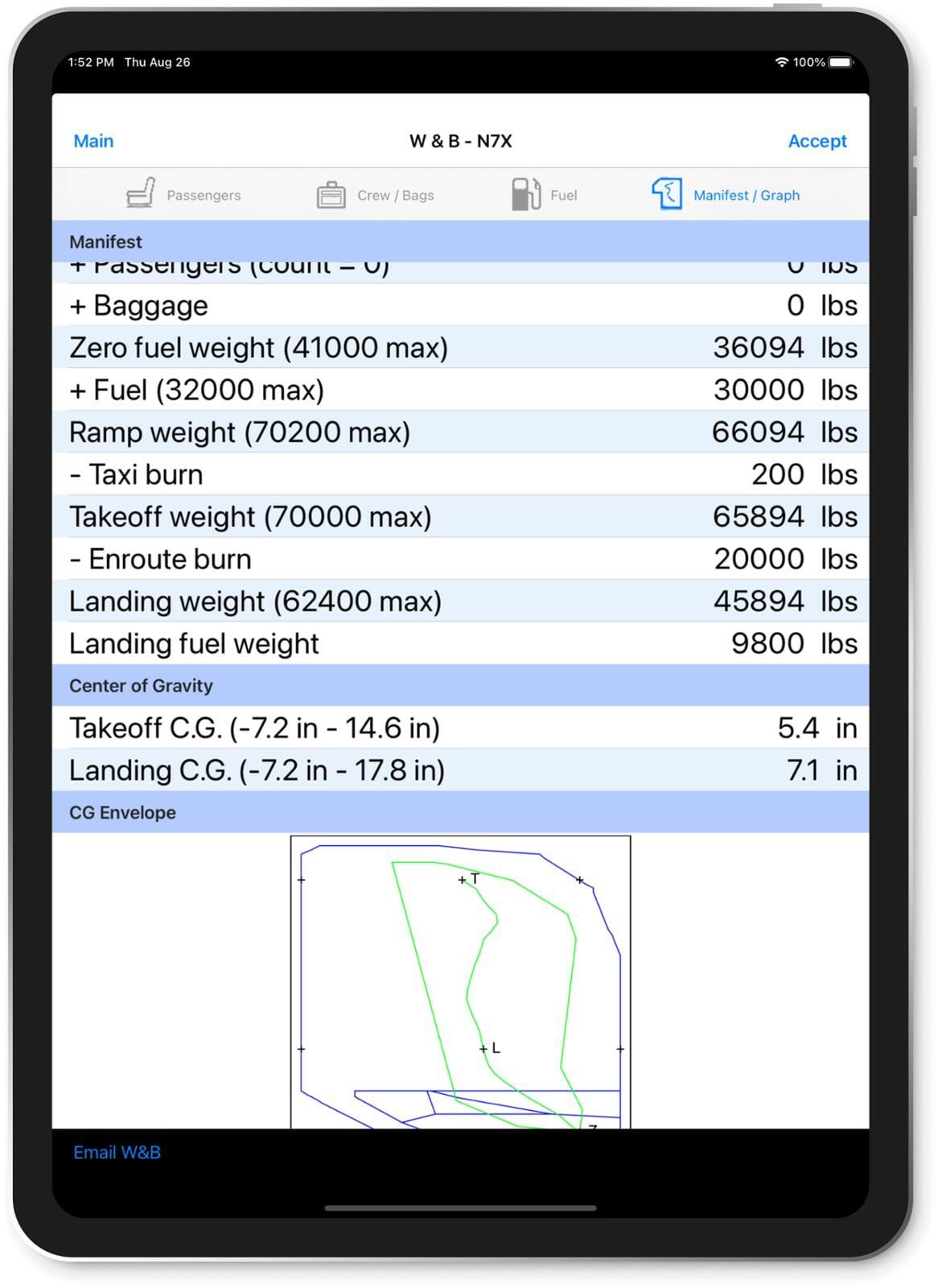 Fuel and cargo loading is simple and straight forward. The manifest screen displays the BEW of the aircraft with subsequent additions and subtractions (ie total pax weight and count, taxi burn etc) with limitations highlighted such as Ramp, Zero Fuel and Landing weights. Numbers outside of the envelop are shown in red. The form can be emailed. The graph of the CG envelop with the fuel burn overlaid. The CG limits for the takeoff and landing weights is displayed.