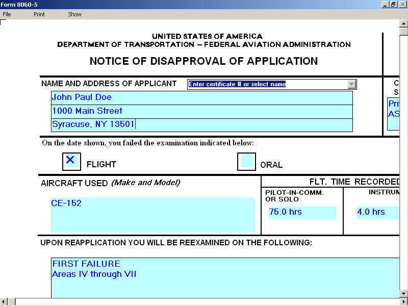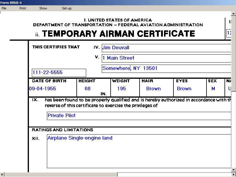 This windows-based application that allows the user to complete FAA approved Temporary Airman Certificates remotely without being connected to the internet.  The forms can be saved, edited and reprinted which is helpful when entering add-on ratings. Notice of Disapproval (-5) requires salmon colored paper. Two forms are printed on each sheet.