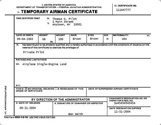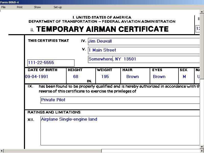 This windows-based application that allows the user to complete FAA approved Temporary Airman Certificates remotely without being connected to the internet. The forms can be saved, edited and reprinted which is helpful when entering add-on ratings. Notice of Disapproval (-5) requires salmon colored paper. Two forms are printed on each sheet.