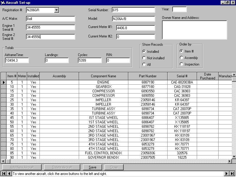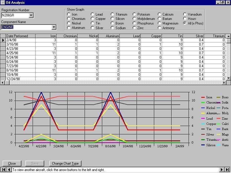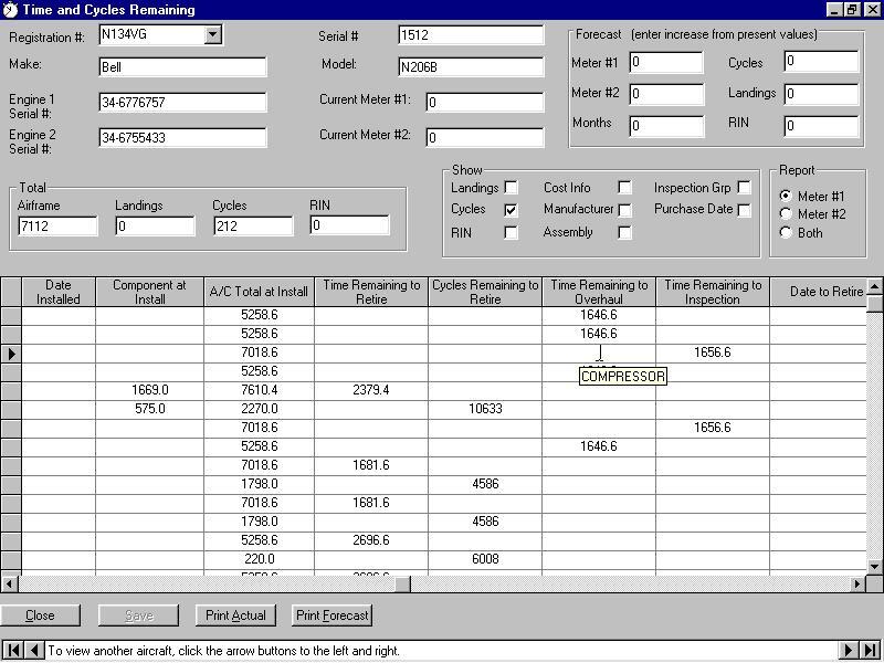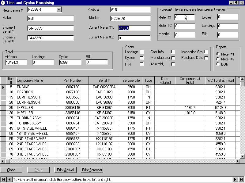 A windows-based application that allows the tracking of component parts based on cycles, airframe time, landings, total age etc. by tail number. Components are tracked by serial number, cost to replace, reserve per hour, service life and oil analysis. Oil analyses can be tracked by tail number and trend graphs.