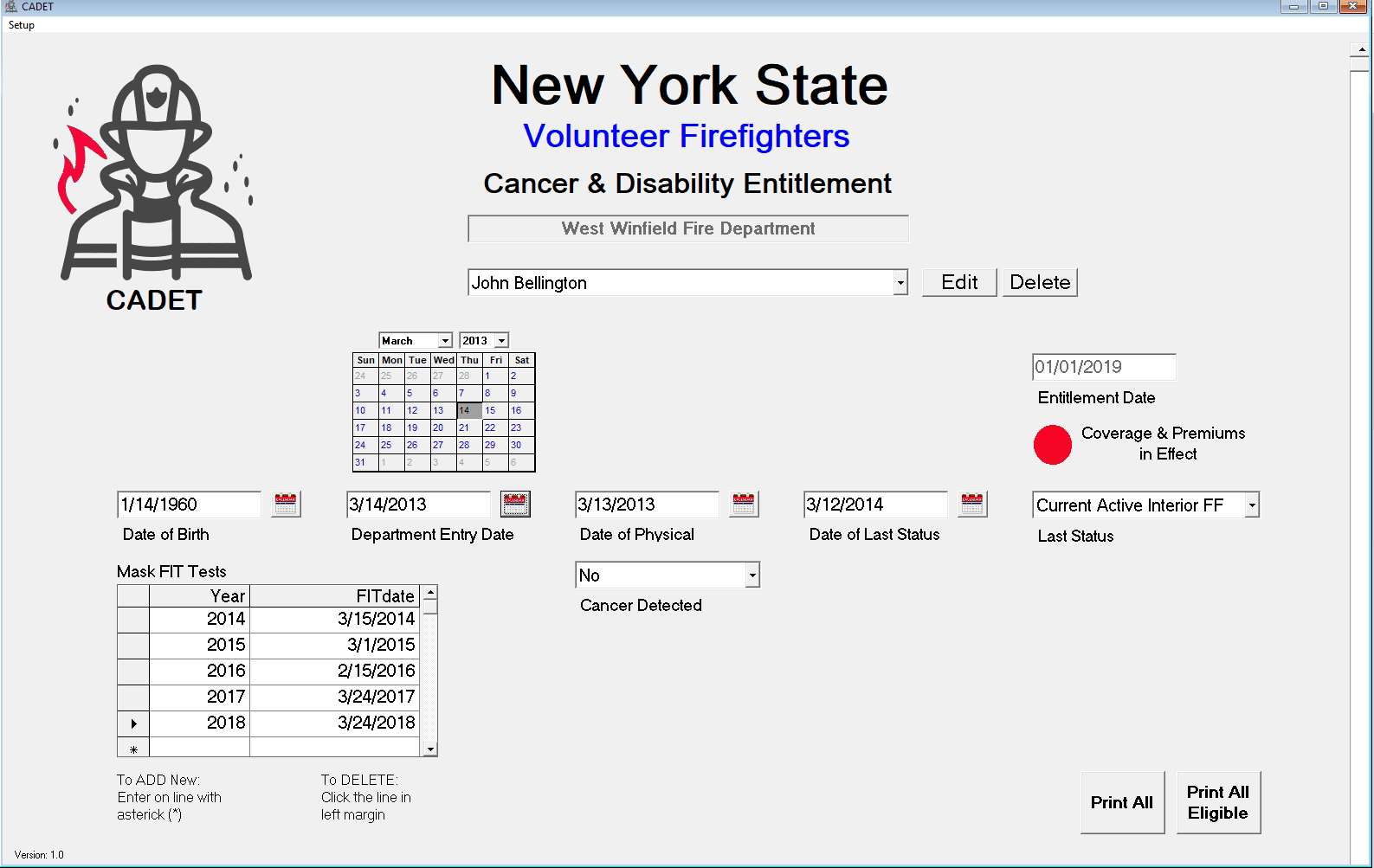 On the main page, enter dates and occurrences of Mask Fit tests, physicals and the current or latest status change of the individual. Sample firefighter data is included in the database to guide you. Once you have the hang of it, you can delete him. Since the coverage does not begin until January 1, 2019, no one will actually appear with a “GREEN Coverage & Premium in Effect” icon until after that date. If they meet all other criteria, the entitlement date will display as 1/1/2019.