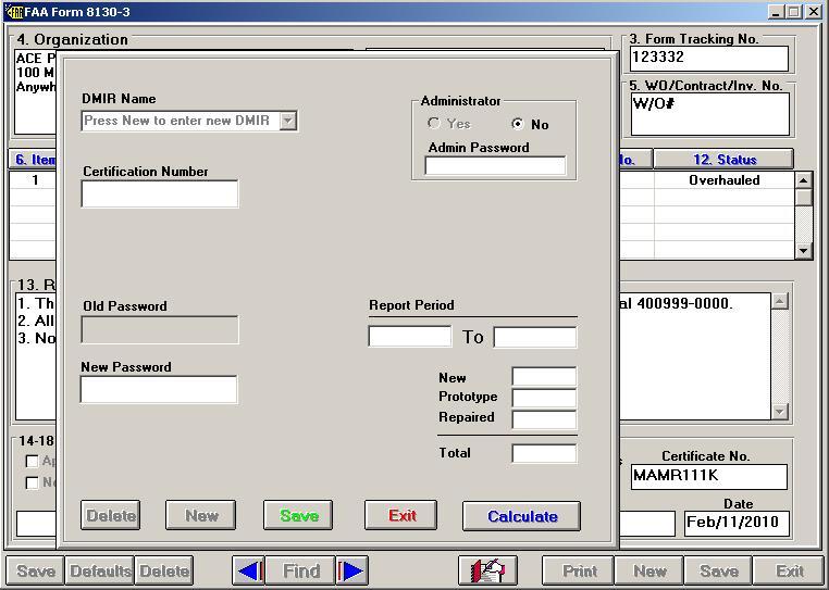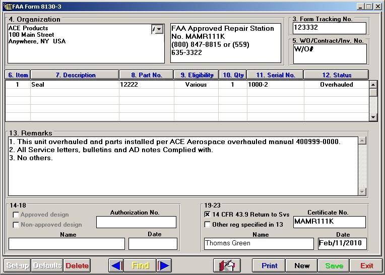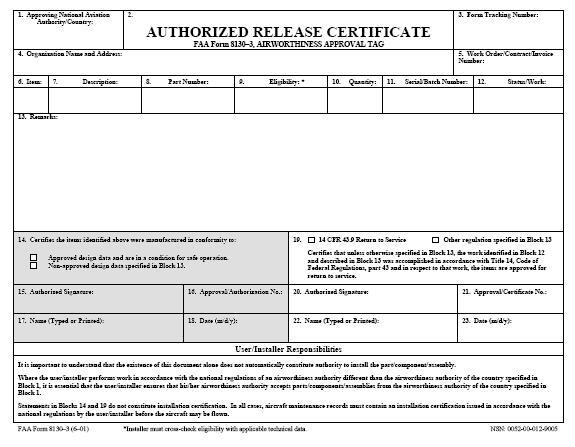 Form 8130 for Windows is a self contained windows program that allows the user to complete the FAA Authorized Release Certificate (previously known as the Airworthiness Approval Tag) on-screen and print out the FAA approved forms on plain white paper.